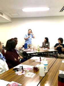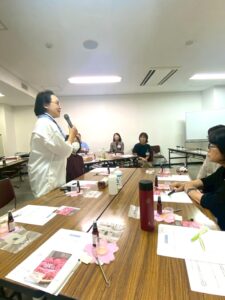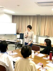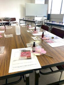 実はその香りは、講師の伊藤令子先生が40分以上も前から会場入りされ、香りのボトルや準備を丁寧に整えてくださったおかげなのです。伊藤先生は、NPO法人日本ハーバルアロマセラピスト協会の理事であり、認定講師・富山支部代表としても広くご活躍。今回のようなセミナーも各地で開催されており、アロマの魅力をさまざまな形で伝えておられます。