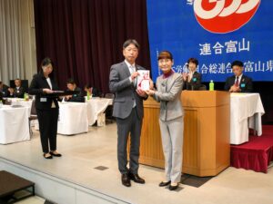 連合富山では、「虹のかけはし」に毎年60万円計上され、1団体10万円を上限に、物品購入に対して助成されています。今年は、4団体が交付を受け、10月15日、連合富山第39回定期大会に出席された150人の企業人の前で授与式が行われました。